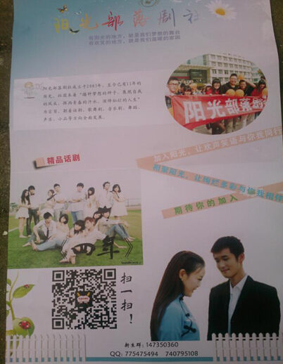 本网讯(通讯员:beat365中文官方网站社团联合会)阳光部落话剧社一年一度的学生社团招新活动于2014年9月15日在校园大道旁社团摆点处拉开帷幕。