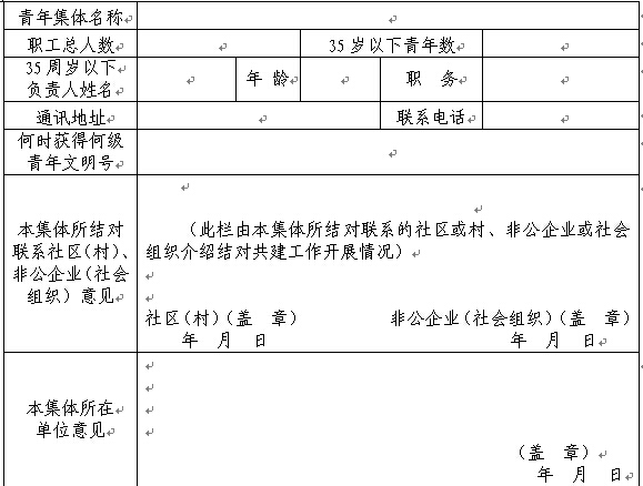 1.青年集体人数一般应该在3人以上100人以下。其中,35周岁以下青年人数占60%以上,且至少有一位年龄不超过35周岁的负责人;
