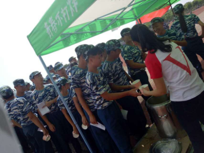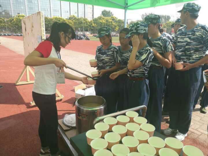 休息之余,青年志愿者协会的志愿者们抬着一桶桶绿豆汤为各中队新生解暑清凉。在品尝绿豆汤之时,新生老生借此机会进行了情感上的交流。期间,老生们分享了自己的军训心得,并鼓励新生在训练场上要发扬不怕苦,不怕累的精神,坚持到底就是胜利。新生在领取完绿豆汤后很有礼貌的说声“谢谢”,并不忘给自己的教官带上一碗。最后,新生们向志愿者们表达了深切的谢意,并表示一定不辜负大家的期望,争取在军训中取得良好成绩。