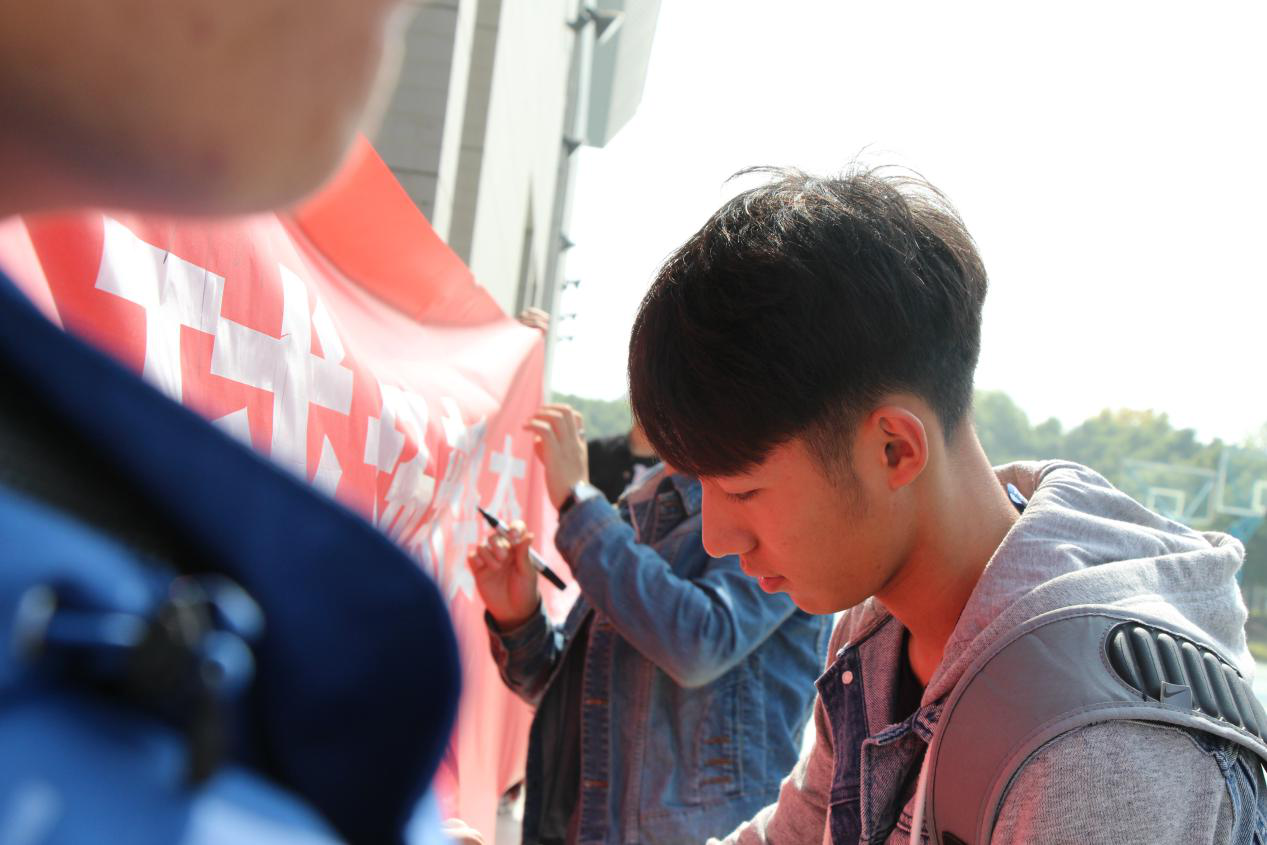 (图为各学院篮球队队长在横幅上签字)