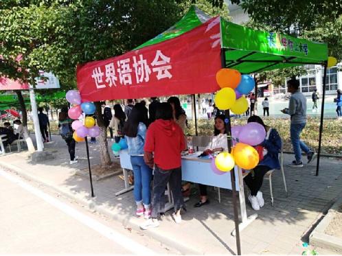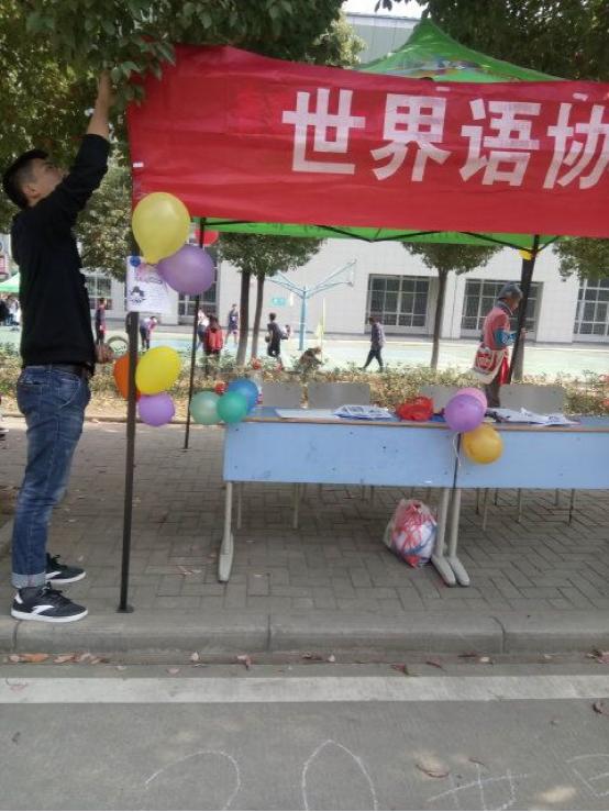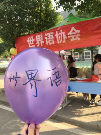 各色的气球使得世界语协会的帐篷格外不同,气球上面的字也代表了协会成员对社团的热爱。