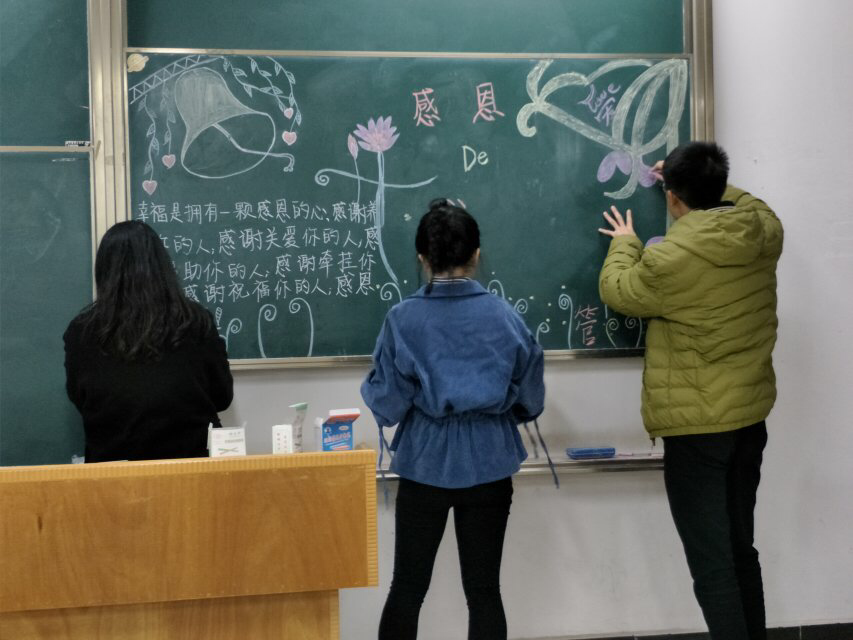 本网讯(通讯员 孟繁宇)11月22日晚我校青年马克思主义研究会在综合楼举行了感恩手绘活动。本次活动有各学院分会参加,活动的主题是感恩身边的人和事。感恩节是西方国家的节日,各分会宣传部部员还有其他分会代表通过黑板报手绘的方式向同学们传达这次活动感恩的主题。