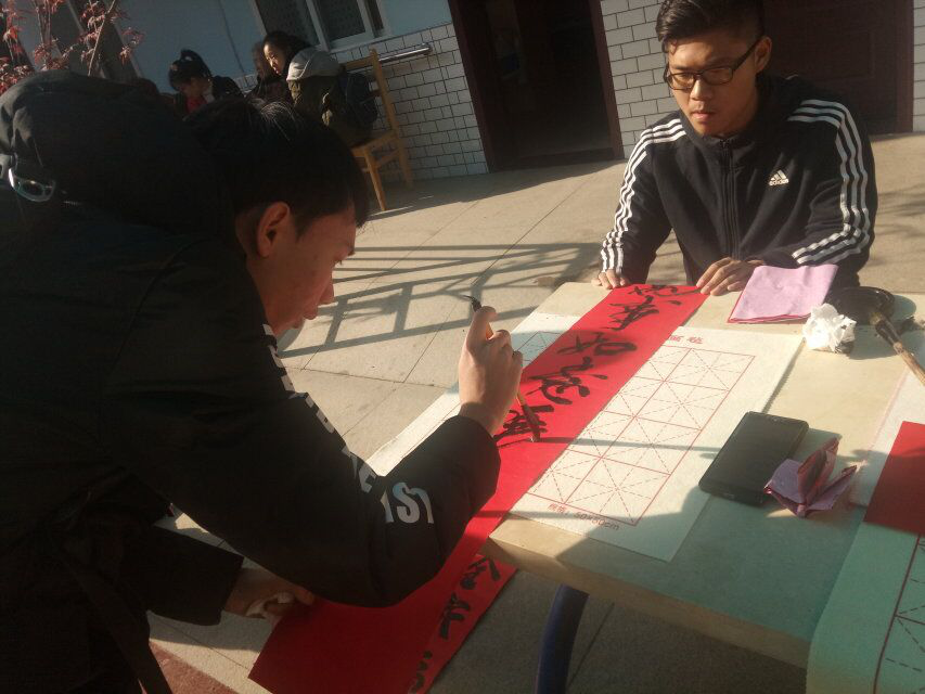 养老院内热闹非凡,志愿者们搬来桌子,在院内就开始认真的为老人书写对联:“福星高照全家福,春光耀辉满堂春。”一笔一划无不书写了志愿者们的心声和真挚的祝愿。秀丽的字体引来不少老人们的围观,都为志愿者们送上称赞。志愿者们为老人送上对联后,这位老爷爷也不堪示弱,也拿起笔写起来了,仿佛在与同学们比赛看谁写得好似的,他说:“我年轻的时候那是写得一手好字,别人都夸我的字写的好看,现在好长时间都没碰笔了,人老咯,跟你们这些小娃子比不起了。”“哪有,爷爷您还年轻着呢,一点也不老,字还是写的那么好看”志愿者们谦虚的说道。