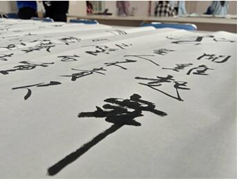 三点钟交流会准时开始,同学们开始研磨展纸,进行有条不紊的准备。交流会现场,墨染生宣,书香四溢;伴随着校艺术团同学献上的琴声阵阵,同学们有的握笔正坐,研习字画;有的提笔摆弄,跃跃欲试;校长与领导更是笔走龙蛇,吸引不少同学围观。除此之外校长还跟同学们交流很多关于书画