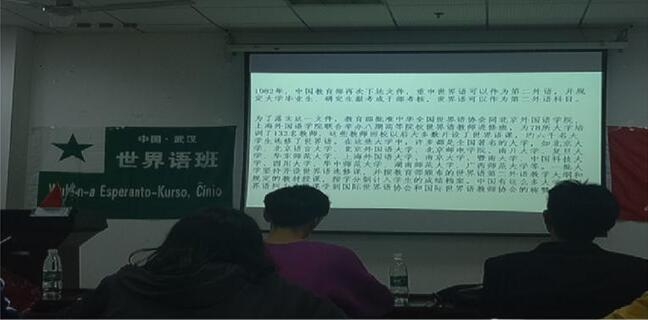 这次宣讲大会,是在星期五晚上七点,图书馆二楼的读者培训室进行的,这次活动的主办方是世界语协会,而参与者有本协会的成员,还有其他协会的成员以及对世界语感兴趣的同学,其中有三位世界语老师,而这一次主要由世界语其中的一位老师——熊老师和我们交流。她让我们对世界语有了新的了解和认识。为了我们对世界语有深刻的印象,熊老师为我们进行了深刻而又有趣的宣讲。