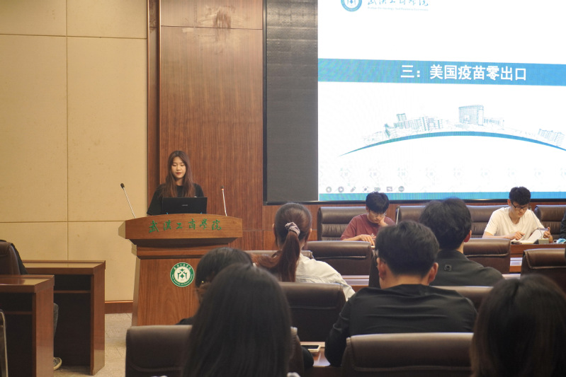 大会的开始,由物流管理学院分团委副书记杨婷婷开头,她就数字中国建设峰会和美国疫苗零出口这一情况展开了深入说明,将美国这种囤积疫苗却不与他人分享的做法,对于其他国家所造成的影响进行了详细的介绍。新冠疫情依然在全球蔓延,虽已有多款疫苗问世,但全球疫苗供应始终紧张,美国这种自私狭隘的做法严重破坏了国际社会秩序,从而遭到了包括盟国在内的国际社会的广泛批评。