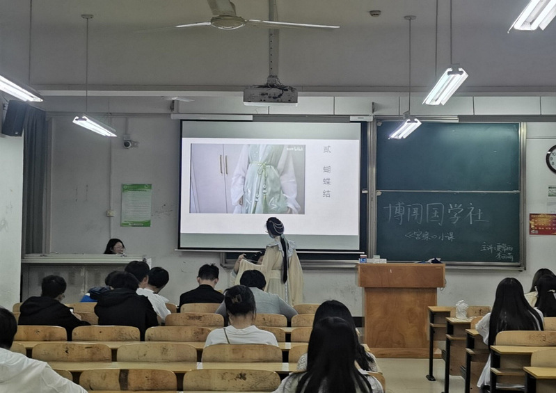 社长张满对于本次小课进行了总结:本次小课主要是为了使喜欢汉服的同学更加深入的了解汉服文化,进行一个更加专业化、细致化的讲解与示范。通过主讲人夏常雨的示范和李雨萌的补充讲解,让社员们掌握汉服宫绦的七种系法。