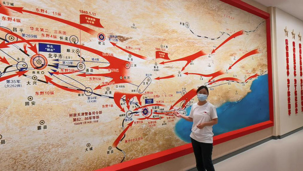 为进一步了解平津战役,红沿实践队紧接着动身前往位于天津的平津战役纪念馆。7月26日上午,实践队到达目的地,聂荣臻元帅亲笔题写的“平津战役纪念馆”七个金色大字,镶嵌在展馆的巨大牌楼式眉额上,为纪念馆增添了光彩和神韵。进入纪念馆内,大厅正中央的铸铜雕像为《走向胜利》,据实践队带队老师艾萍介绍,铜像五人分别为中共中央毛泽东、刘少奇、朱德、周恩来、任弼时五位领导人。队员们表示仅仅通过铜像,都能感受到五位的领袖风采。而后队员们在老师带领下进入纪念馆参观学习,馆内对平津战役的各个时期都做了整体的介绍。实践队涂婷老师为同学们讲解了平津战役整体路线示意图,让同学们更加清晰与直观地了解平津战役过程中人民解放军的走向与主要战场分布。