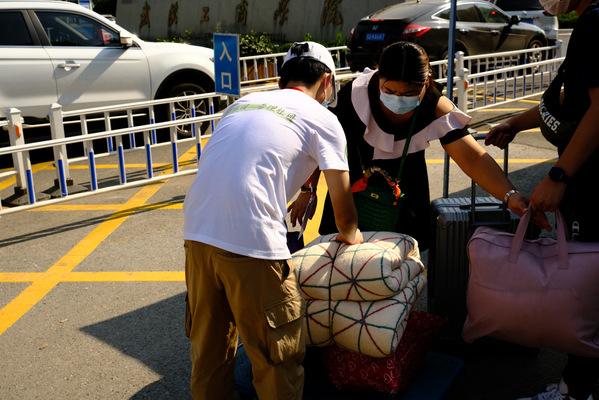 (图为志愿者帮忙搬运行李))