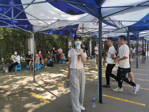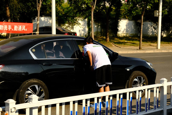 (图为志愿者引导车辆有序进校)