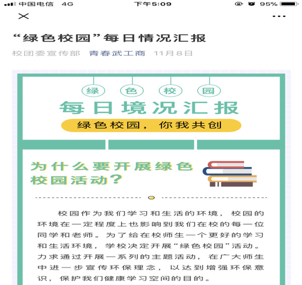 5.每个月第二个星期星期四下午作为固定“园地文化日”,校学生会全体成员以及各二级学院一同行动,对校园进行检查及打扫。