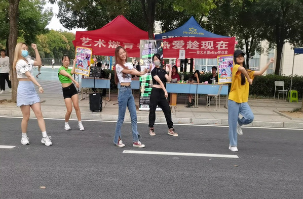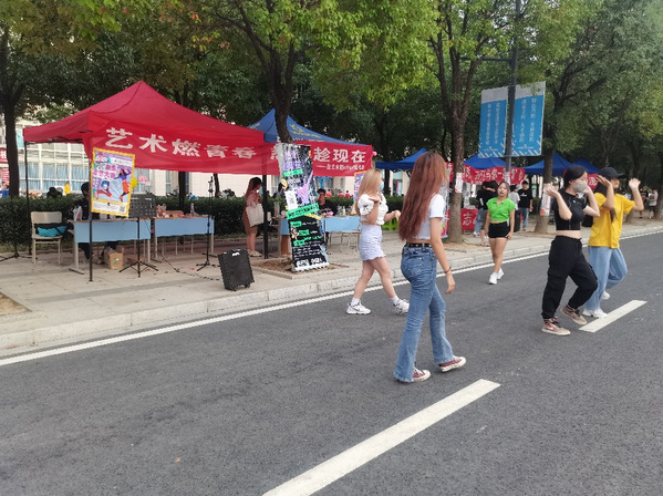 在23号和24号摆点期间,校艺术团安排了特色部门的部委在上下课人流量高的时间段表演节目,吸引同学前来摆点招新处咨询和报名校艺术团,在23号中午12:00下课,由舞蹈部部长陈芷艺带领部委在摆点招新帐篷前跳起了随机舞蹈,舞蹈动作整齐划一,舞曲乐声动耳。