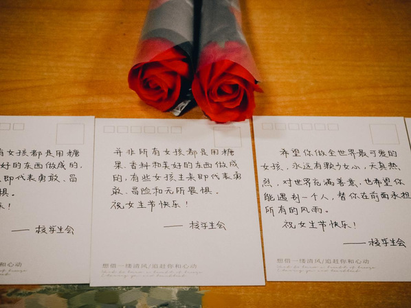 这次女生节系列活动是以“一束花的浪漫永不过时”为主题。一束束鲜花和一句句祝福都将作为惊喜遍布在校园的各个地方,不经意的一瞥就能发现微小的浪漫。活动在3月6日即开始精心准备,由校学生会的同学们手写贺卡,配上积极向上的鼓励语,让人倍感真诚。