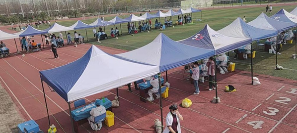 此次的核酸检测,许多医护人员来到我们学校为我们进行核酸检测,为了保证核酸检测的秩序,学校社团志愿者们积极协助医护人员工作。为了更好地完成此次检测,学校规定了每个学院做检测的时间段,减少人员密集。上课中的老师积极配合防控工作,学生们下雨天打着伞吹着冷风排队。值班人员提醒着每一位同学保持一米以上的距离。医护工作者为每一位师生进行检测。