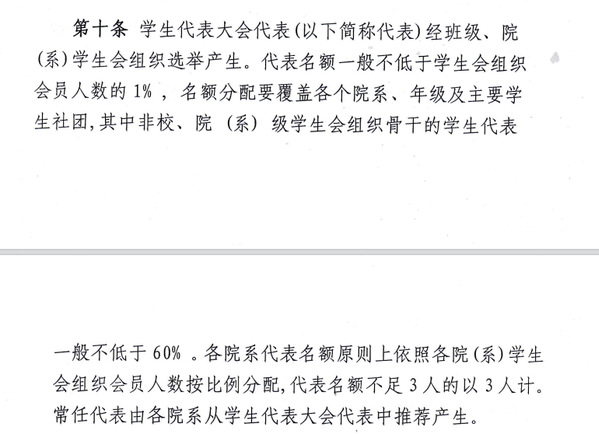 第十六条 学生代表大会代表经班级、学院学生会组织选举产生,代表名额不少于学生会组织所联系学生会人数的1%,名额分配要覆盖各个学院,各个年级,各个专业,各个社团,其中非校、院级学生会骨干的学生代表不低于60%。