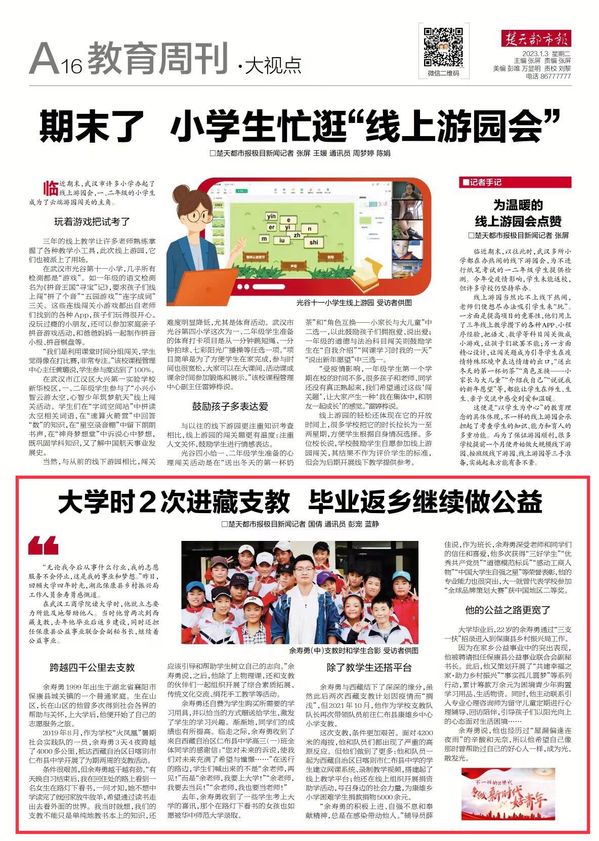 这次支教,条件更加艰苦。面对4200米的海拔,他和队员们都出现了严重的高原反应。但他们做到了更多:他和队员一起为西藏自治区日喀则市仁布县中学的学生建立网课系统、录制教学视频,搭建起了线上教学平台;他还在线上组织开展捐资助学活动,号召身边的社会力量,为康雄乡小学困难学生捐款捐物5000余元。