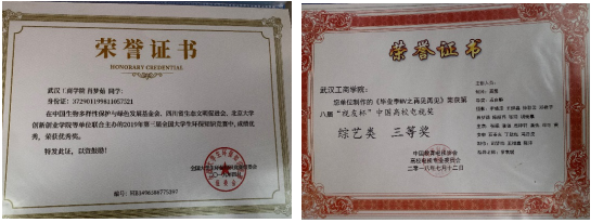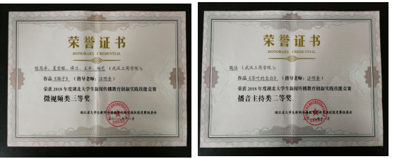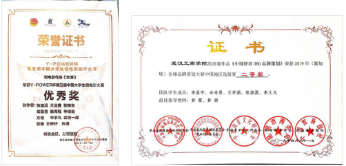 张滨淏同学在2019年全国大学生新媒体知识竞赛中获得国家级三等奖;和许潇等人编导的作品《自渡》中国大学生微电影创作大赛中获得优秀奖;参赛作品中国虾谷360品牌策划》在全球大学生品牌策划大赛中获得国家级二等奖。肖梦茹同学2019年第三届全国大学生环保知识竞赛中获得优秀奖,制作的《毕业季MV之再见再见》荣获第八届友杯中国高校电视奖综艺类三等奖。