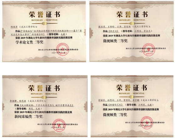 毛毅老师指导下李佳静、程思源的作品《武汉解放路:十里长街历史悠久不尽繁华底色》荣获2019年新闻采编类二等奖的作品《“情境语态”在网络话题博弈中的作用机制分析——基于“重庆公交车坠江事件”的传播分析荣获2019年学术论文类省部级二等奖。