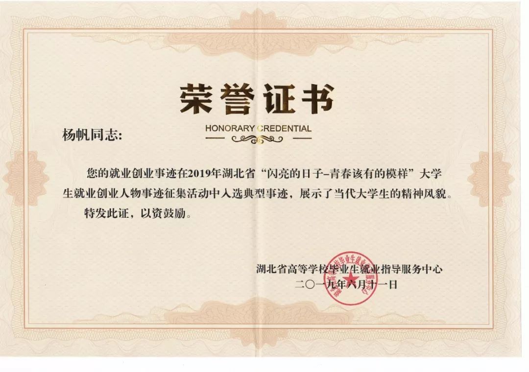 在校期间,在校期间,杨帆先后获得过校级优秀团员、2次校级三等奖学金、院级优秀学生干部、院级三好学生、2次校级七彩篮球赛最有价值球员、校级社团篮球赛冠军、校级优秀毕业生等荣誉。毕业后,成功通过全省大学生村官考试,被分配到五峰土家族自治县渔洋关镇南河村就职,现已就职四年多,担任过村党支部副书记。通过四年多的刻苦工作,深入村民群众的生活,现又留村任村党支部书记。在其工作期间,先后获得五峰土家族自治县优秀团干部、渔洋关镇优秀党务工作者、宜昌市脱贫攻坚先进个人等荣誉。他扎根于村民中,获得村民们的认可。