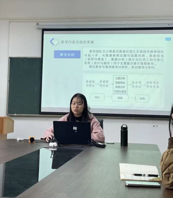 在本次研讨会上,肖赛君讲师首先分享了《数据新闻内容生产与制作》课程的建设经验。她详细介绍了该课程如何对标“省级一流本科课程”的建设指标,在成果导向的理念指导下,构建了“问题-项目-成果”的教学一体化架构,实现了知识、能力、素质等目标的教学融入。