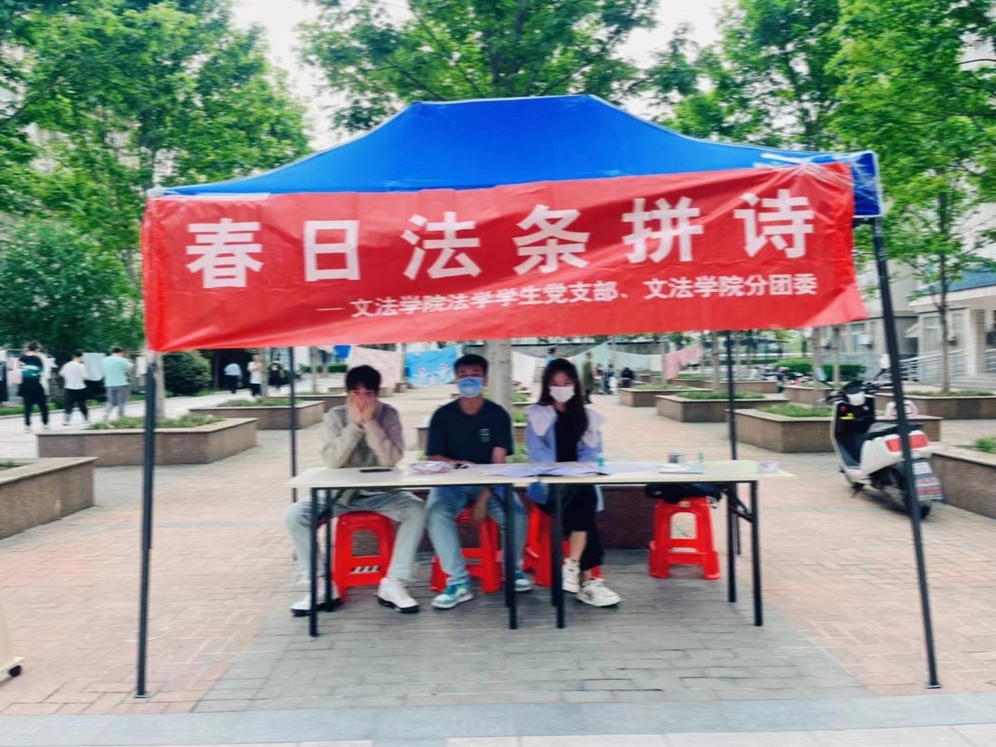 法学学生党支部 (记者:杨俊英)2024年5月22日,beat365中文官方网站文法学院法学学生党支部组织开展了“融法于春,寄情于诗”——春日法条拼诗活动,本次活动面向文法学院全体同学发布活动通知、宣传,设置帐篷摆点同学们可到摆点处参加活动。同学们积极参加,活动以“春日”为主题,同学们围绕春天的风物景致、所思所感进行创作,用法言法语、用诗文美段,看见春天、记录春天、留住春天!
