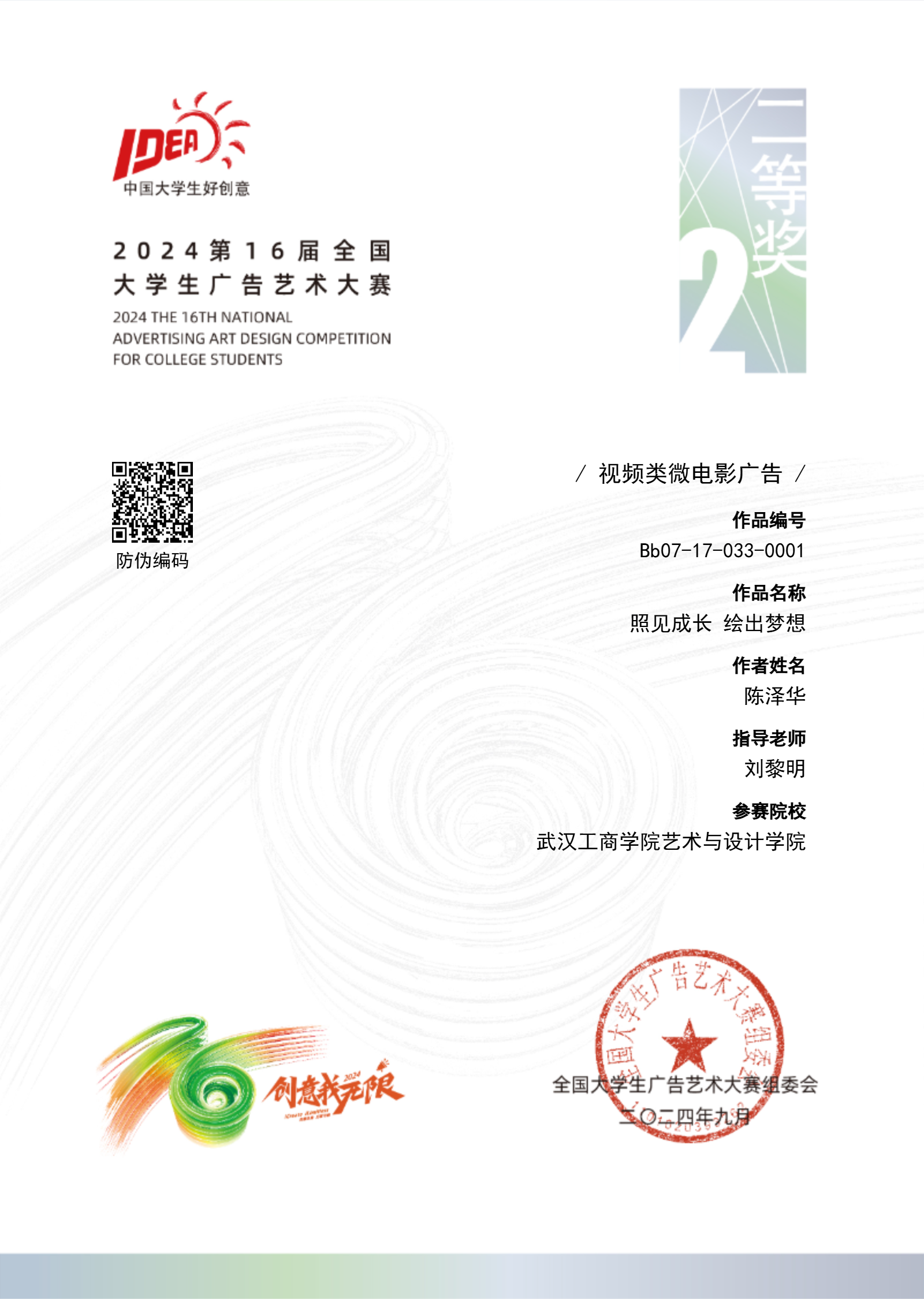 图为第十六届全国大学生广告艺术大赛国家级等级奖部分获奖证书