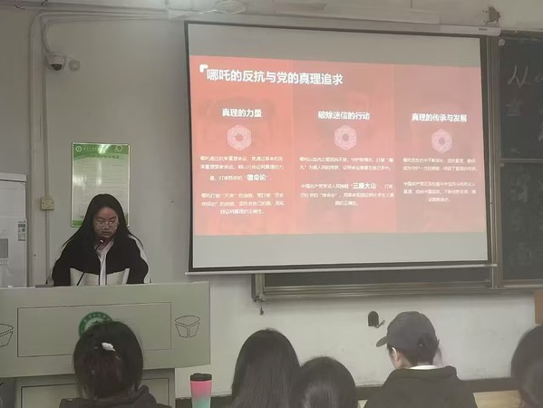 接着,主讲人闵昕带领大家从一个独特的视角,走进动画电影《哪吒之魔童降世》,并以此为切入点,深入探讨伟大建党精神的深刻内涵。哪吒一出生便被定义为 “魔丸”,他的命运从一开始就被贴上了注定为祸人间的标签,然而,哪吒并没有向这既定的命运低头,他以顽强的意志和不屈的精神,用自己的血肉之躯抵挡天劫,在生死的边缘奋力挣扎,最终打破了命运的枷锁,成为了守护陈塘关百姓的英雄。这种抗争精神与早期共产党人在艰难环境中点燃的革命火种相呼应。表面上,它是一部充满奇幻色彩的神话故事的现代化演绎;实际上,它是一部蕴含着抗争、觉醒与奉献精神的壮丽史诗。当我们把目光转向中国共产党的百年奋斗历程时,会惊奇地发现,两者之间有着异曲同工之妙。中国共产党的百年征程,同样是一部改写命运、坚守真理、不懈奋斗的觉醒史诗。回顾中国共产党的百年征程,在那个风雨如晦的年代,中国面临着内忧外患的艰难处境,列强的侵略、封建势力的压迫,让中国人民深陷苦难的深渊。而党用实际行动证明,命运掌握在自己手中,只要坚持真理,勇于实践,就能打破一切桎梏,实现国家和民族的解放与发展。真理的力量,在于行动;命运的改变,始于觉醒。面对“魔丸”的宿命,哪吒选择抗争,这种不认命、不服输的精神,正是党建工作突破创新的动力源泉,也是共产党人初心密码的解码。