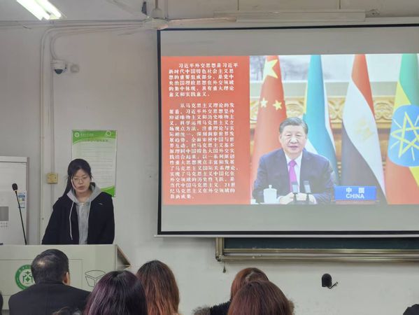 会议首先由主讲人姬钰晗向全体成员强调了贯彻习近平外交思想的重要性以及提升自身国际视野和外交素养的必要性。她指出,习近平外交思想是新时代中国外交的根本遵循和行动指南,是我们党治国理政思想在外交领域的集中体现,当务之急是要深刻理解并践行国家外交政策,不断提升自身的国际视野和外交素养。