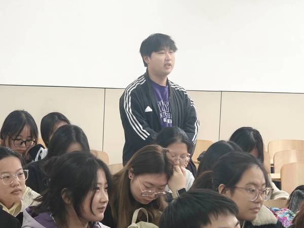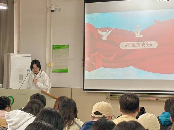 接着由主讲人袁乐乐以“学深悟透抗战史,对照反思强作风”为主题,与在场人员开展了一次深度对话。她首先带领全体与会人员回顾了2025年抗战胜利80周年的纪念活动,通过播放抗战回顾视频和九三阅兵视频,引导在场人员感悟抗战精神,强调了“要记住历史、敬仰先烈、珍惜和平”。同时,她结合抗战精神,深入剖析其在当代作风建设中的价值,指出党员干部应坚持党的领导,查找作风短板,锤炼优良作风,将抗战史学习成果转化为作风建设动力,并呼吁同学们以史为鉴,砥砺前行,在新时代新征程中锤炼作风、勇担使命。