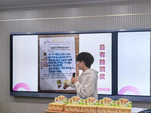 创意挑战环节成为全场焦点。同学们以小组为单位围坐一起,有人捧着专业课本提炼核心知识点当“填空线索”,有人手握彩笔勾勒创意插画做 “视觉包装”,还有人化身 “脑洞达人”,用幽默段子、温情故事为作品注入灵魂。遇到思路卡壳时,组员们互相支招、彼此启发,原本略显陌生的同学,在共同拼凑 “创意答案” 的过程中渐渐熟络。趣味互动环节更添欢乐,抽到 “惩罚” 任务的同学,大方展现才艺,逗得全场捧腹,陌生感在笑声中悄然消散。