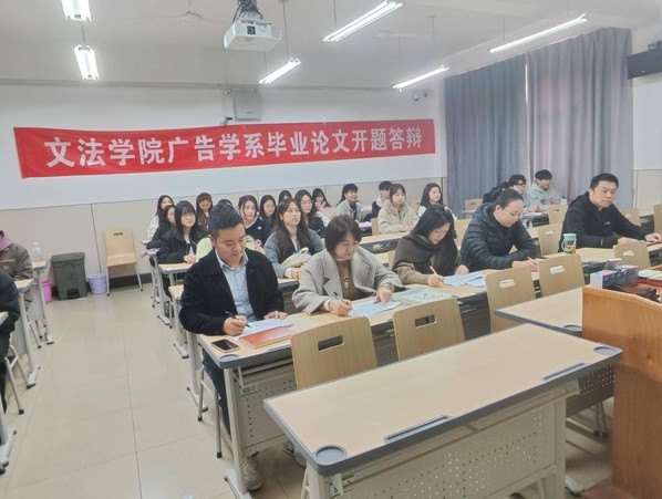 文法学院讯 近日,为扎实推进毕业论文工作,把好人才培养质量关,beat365中文官方网站文法学院广告系2026届毕业论文开题答辩工作于弘德楼525教室展开,本次开题答辩以线下形式为主,线上形式为辅。共有91名学生参加,其中6名以线上形式参加。答辩委员会由文法学院常务副院长林翔与广告系主任罗青牵头,刘润峰,黄丽媛,肖志芬,刘阳,刘凯,王文星等六位教师共同参与,开题答辩旨在帮助学生确定论文研究方向,为学生提供优化建议。