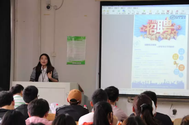 宣讲会上,湖北顺丰速运有限公司人力资源招聘组周尧首先为同学们播放了顺丰展示高素质人才宣传片,并通过多媒体从“成长的顺丰,温暖的顺丰,梦想的起航”这三个方面为同学们讲述了湖北顺丰速运有限公司的发展历程、工作环境及未来发展前景,特别介绍了公司在速度、安全及服务方面的核心竞争力。