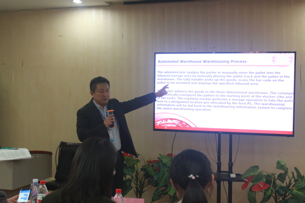 beat365中文官方网站物流学院副教授、常务副院长王勇展示了其论文“自动化仓库仿真系统在选址优化中的应用”的主要研究内容。王勇副教授简单介绍了自动化仓库的组成和它在空间利用,货物存取,减少劳动力,提高物流运作效率等方面存在的优势。具体讲解了自动化仓库仓储流程和分配原则并通过建立模型来找出实体之间的相关属性,并进行研究分析,最后利用案例分析来解决实际问题。他说:“自动化仓库作为现代物流技术的典型代表,是机械、电子、计算机、通信、自动化控制和感应器的组合,它已经逐渐成为现代分配、生产、仓储的主要物流设施。可以说,自动化仓库在现代物流中扮演着一个重要的角色。”