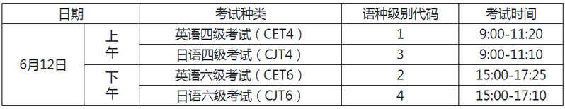 根据教育部考试中心及湖北省教育考试院的统一安排和部署,作为全国大学英语四、六级考试考点,学校将于6月12日和5月22至23日分别举办笔试(以下简称CET)和口试(以下简称CET-SET),其中本次笔试开放小语种日语报考。凡符合报名资格的我校学生均须在指定网址完成报名、缴费。现将报考有关事项通知如下: