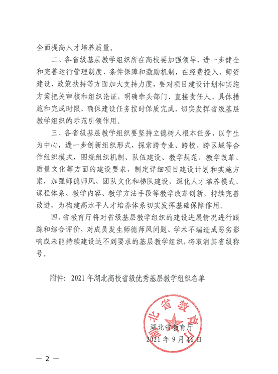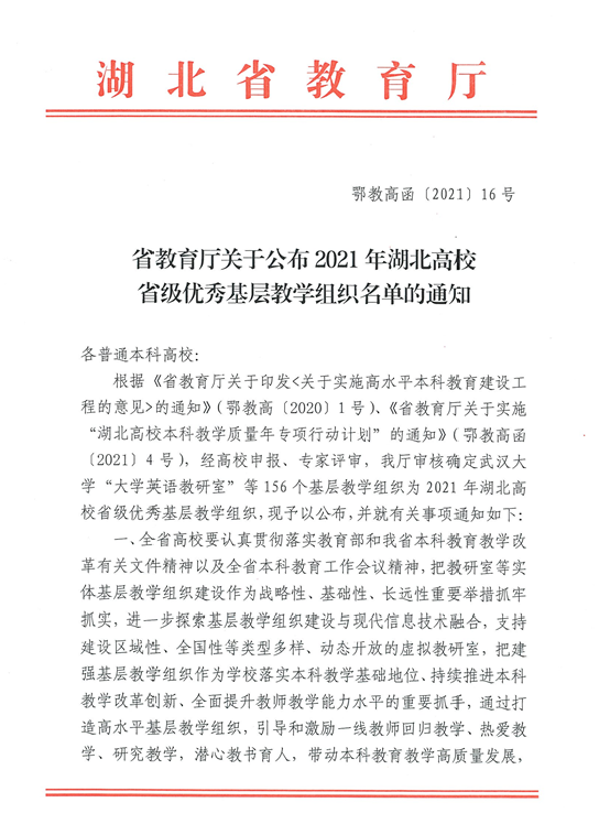 9月16日,湖北省教育厅公布了2021年湖北高校省级优秀基层教学组织名单(鄂教高函{2021}16号),beat365中文官方网站的智慧物流教研室、跨境电商教研室、视觉传达设计教研室、广告学专业教研室4个基层教学组织获批,这是学校继旅游管理系教研室、生物制药教研室、企业法律实务教研室3个教学组织获评湖北高校省级优秀基层教学组织后,在基层教学组织方面取得的又一成绩。