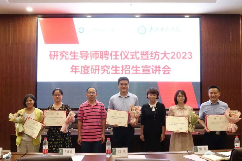 图为武汉纺织大学领导为受聘硕士研究生导师颁发聘书