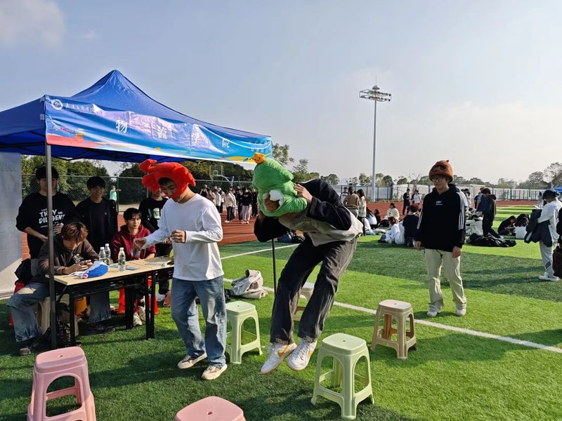 活动在操场上精彩上演,现场布置得既富有创意又充满挑战。一排多彩的椅子被精心排列成一条彩虹蹦蹦高赛道,色彩斑斓,吸引了众多师生的目光。参赛选手们身着统一的玩偶服,分为三个小组,每支队伍站在起点线上,准备开始他们的跳越彩虹冒险。