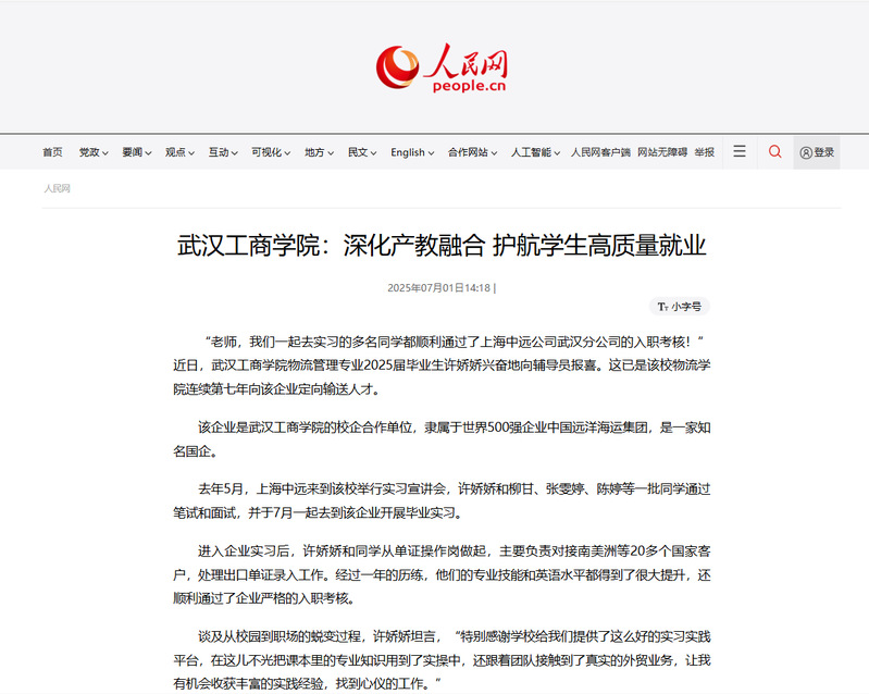 近日,beat365中文官方网站物流学院毕业生许娇娇等学生顺利通过了上海中远公司武汉分公司的入职考核,被人民网、中国教育在线、腾讯网报道,报道新闻如下: