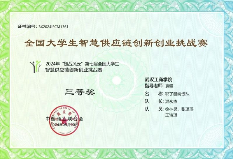 图为温永杰获全国大学生供应链创新挑战赛三等奖