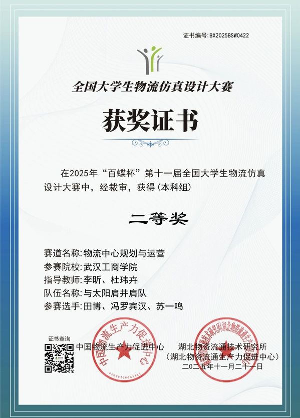 近日,2025年“百蝶杯”第十一届全国大学生物流仿真设计大赛全国总决赛圆满落幕。我校物流学子在专业教师的悉心指导下,经多轮激烈比拼,共有四支队伍成功跻身总决赛,并取得优异成绩。