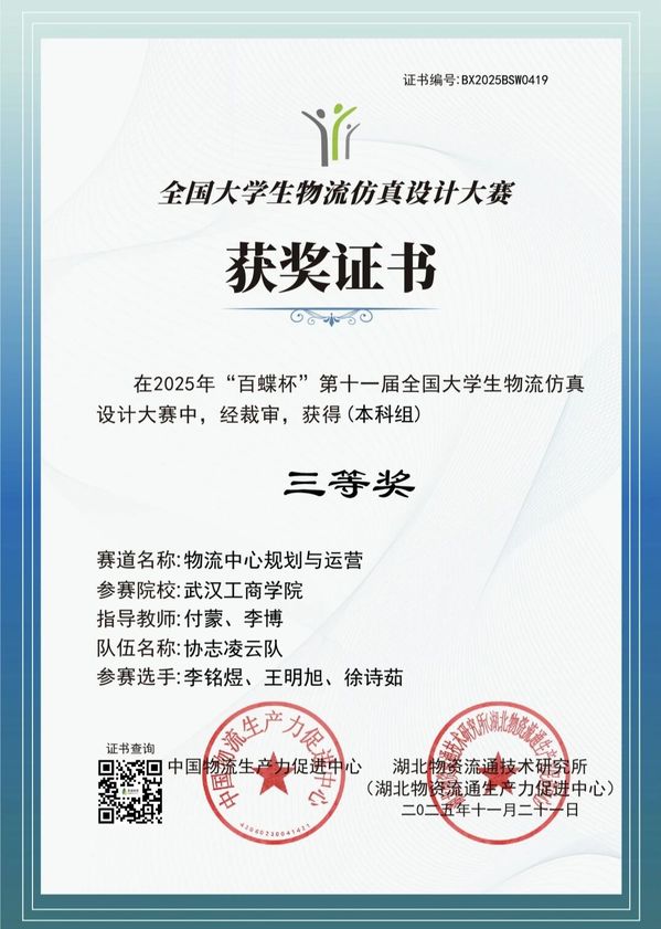 由杜玮卉、李昕老师指导的与太阳并肩队(田博、冯罗宾汉、苏一鸣)和由付蒙、李搏老师指导的协志凌云队(李铭煜、王明旭、徐诗茹)在物流中心规划与运营设计赛道分别获得二等奖和三等奖。