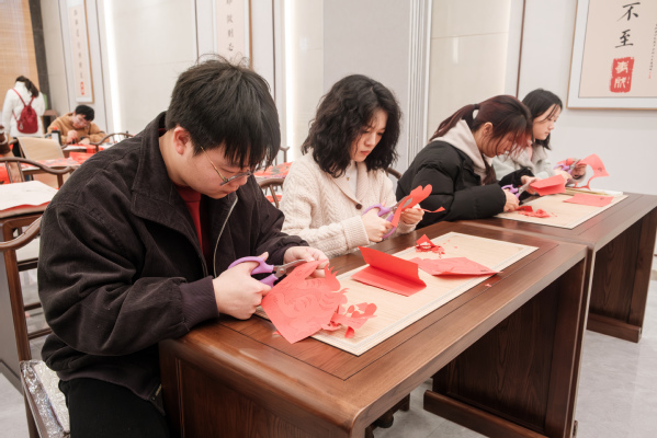 在剪纸环节,通过工作人员的讲解与悉心指导,大家逐渐掌握了剪纸的技巧,梅花、杜丹花、兔子、灯笼等一张张生动的剪纸作品跃然而出,传递着浓浓的中国年味和新春的祝福。