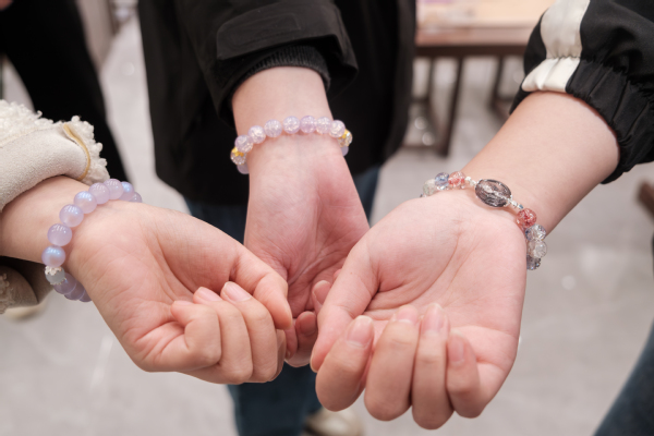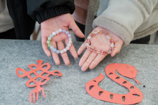 工作人员还准备了仿烧蓝、珐琅吊坠,以及色彩斑斓的琉璃珠子,大家纷纷动手体验,将个人风格和对传统文化的理解融入其中,编织出了属于自己的独一无二的时尚手链。