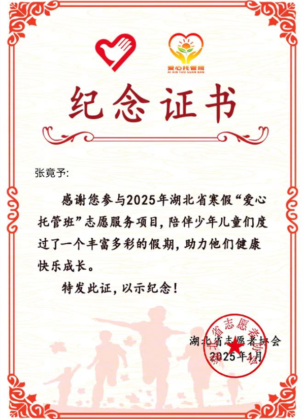 在本次活动中,张竟予担任宜城市学苑社区爱心托管志愿团队队长,负责统筹、协调托管班的日常工作,并围绕“德智体美劳”五育融合的目标,设计了一系列丰富多彩的课程活动。寒假期间,他们组织托管班的孩子们学习唐诗宋词、中共党史,参观宜城市孝文化馆,辅导寒假作业,组织开展体育游戏、美育剪纸和绘画等活动,并通过日常劳动教育,帮助孩子们树立正确的劳动观念。