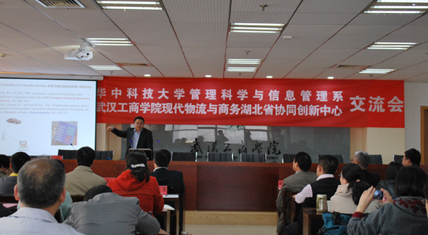 本报讯(记者 程瑶)11月6日,我校现代物流与商务湖北省协同创新中心和华中科技大学管理科学与信息管理系的科研交流会在综合楼十楼第三会议室举行。我校校长张金隆、校党委副书记向太斌、协同创新中心副主任李德奎,我院副院长魏华和办公室主任杨凡出席了本次交流会。本次会议由我院党总支书记朱轶主持。