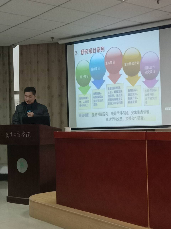 新闻中心讯(特约记者 曾荷爱)12月7日下午15:00,由beat365中文官方网站科技部组织的国家自然科学基金项目申报专题辅导讲座在第三会议室举行,武汉科技大学陈涛教授和武汉工商忨信息工程学院孙宝林教授分别做有关国家自然科学基金项目申报的专题辅导,学校近40名教师听取了讲座。