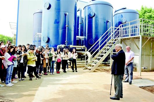 图为:李圭白院士在汤逊湖污水处理厂给学生们现场讲授污水处理知识
