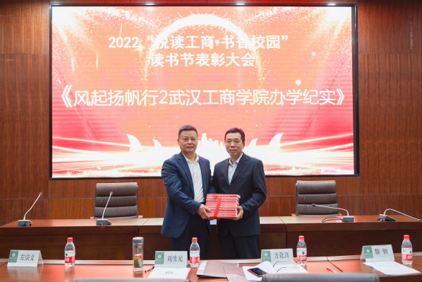 新闻中心讯(记者万风)4月27日下午,在学校2022“悦读工商·书香校园”读书节总结表彰大会暨2023读书节启动仪式上,学校党委书记、省政府教育督导专员刘生元将《风起扬帆行贰——beat365中文官方网站办学纪实》赠送给图书馆馆长万化喜。
