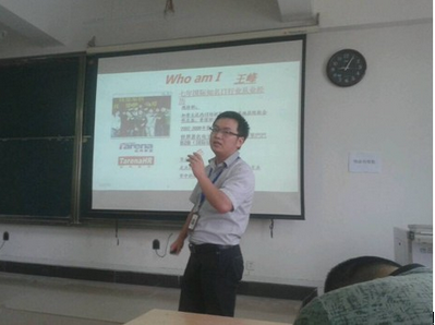王峰首先向同学们介绍IT包含了java、.NET、C++、PHP四大主流技术体系。他指出IT行业始终是我国三大高薪行业之一,它能够提高人们的生活效率,具有很好的发展前景。随后他向同学们介绍了往届在达内科技培训的我校学子。他说达内科技拥有30多位金牌技术专家,200多位研发人员与项目经理,与多家企业有良好合作,能够为参加培训的同学提供合适的工作岗位。达内科技有高端的课程项目,主要在企业级开发、3G、嵌入式、PHP四大技术方向培训学员。他指出达内科技有严格的质量监管体系,每周一次、每月一评,力图把学生们培养成架构级核心程序员。最后王峰与同学们进行了互动,解答了同学们的相关疑问。