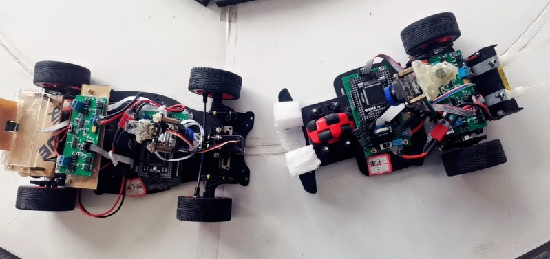双车接力组车模宽度不超过25厘米,高度不超过20厘米,长度小于30厘米。双车车模中,其中一辆车模的微控制器使用Infineon公司的单片机,另外一辆车模可以使用Infineon, STC, NXP公司的单片机。允许使用各类电磁、红外光电、超声传感器器件进行赛道和环境检测。不允许任何摄像头传感器、激光传感器等。一辆车模在赛道中间指定位置停止。一辆车模从车库出发,到达中间车模位置时,将车上的一个尺寸不小于40厘米见方的球体传递给第二辆车模,第二辆车模带着球体返回车库。传递的球体可以使用标准的乒乓球,或者高尔夫球。也可以另外自制其他材质的球体,只要其直径不小于40毫米即可。